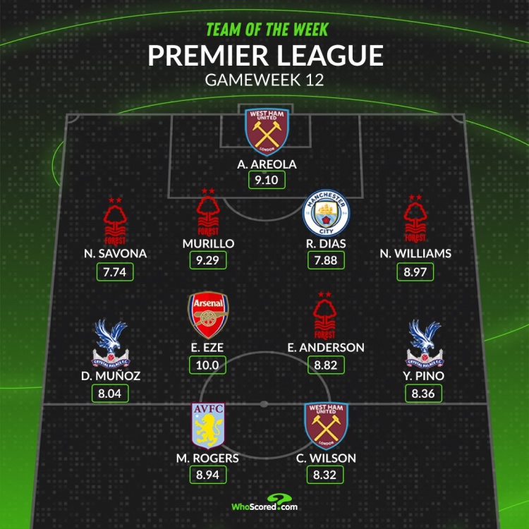 WhoScored英超第12轮最佳阵容:埃泽、鲁本·迪亚斯在列,森林4人