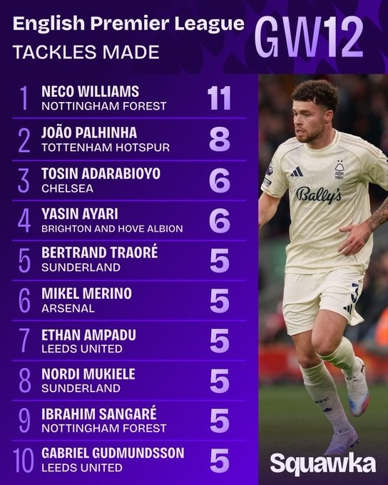 值得一提的是,11次成功抢断既是诺丁汉森林升上英超之后的单场抢断纪录,也是本赛季英超球员单场最多。
