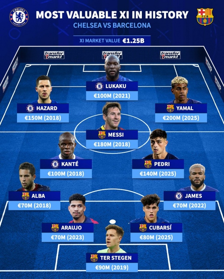 零点吧足球11月25日讯 巴萨将在本轮欧冠焦点战客战切尔西,《转会市场》也列出了一套两队历史最贵身价合体阵。