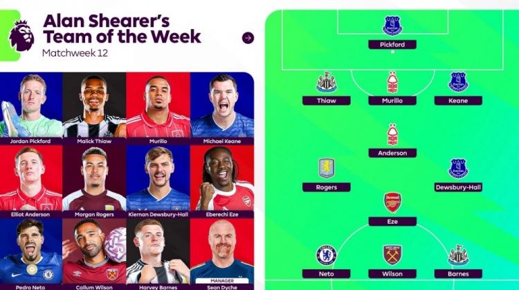希勒评英超第12轮最佳阵:皮克福德、埃泽、摩根·罗杰斯在列
