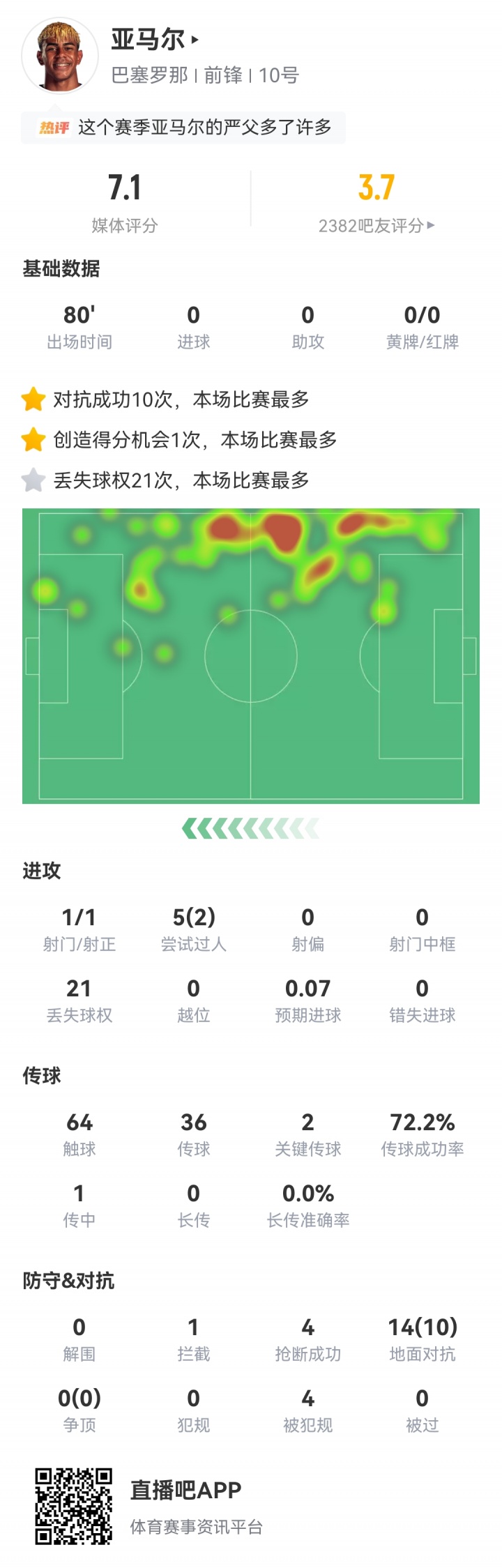 这是亚马尔职业生涯的第3次欧冠之旅,却只是他第一次面对英超球队,从数据上看,亚马尔14次对抗10次成功、4次被犯规的数据相当不错,但最终的比赛结果还是给了他当头一棒。