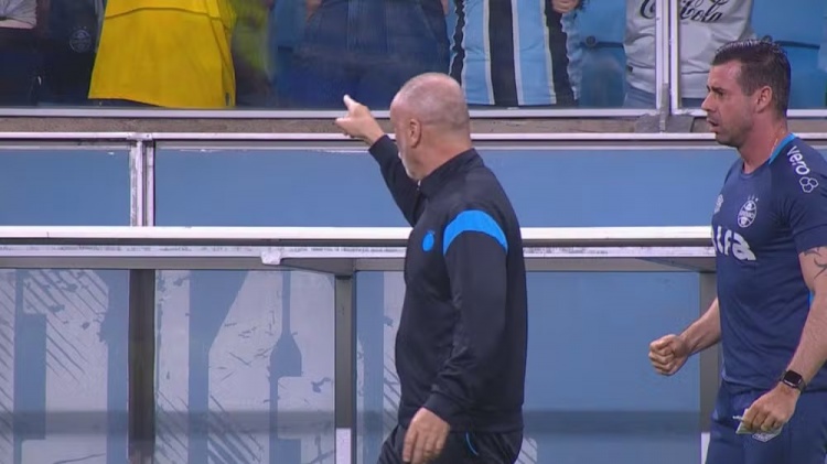 攻入扳平进球后,格雷米奥主帅向坐在替补席后的一名球迷竖中指