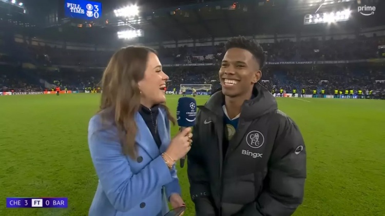 零点吧足球11月26日讯 欧冠联赛阶段第5轮,切尔西3-0完胜巴萨。英媒sportbible报道,亚马逊记者亚历克斯·艾尔乔因用英葡双语对埃斯特旺进行赛后采访而走红,获赞“赛季最佳采访”。