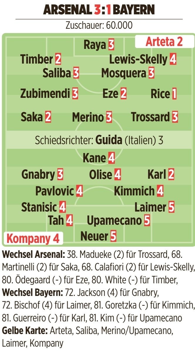 零点吧足球11月27日讯 拜仁在本轮欧冠客场1-3不敌阿森纳,《图片报》在赛后为两队将帅评分。
