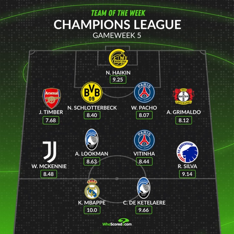 零点吧足球11月27日讯 WhoScored根据球员的评分列出欧冠第5轮最佳阵容,姆巴佩领衔。