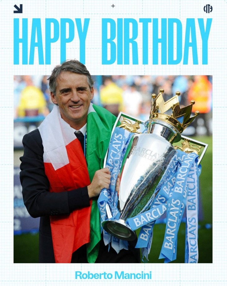 零点吧足球11月27日讯 今天是意大利名帅曼奇尼61岁生日,曼城官推也晒出曼奇尼昔日手捧英超冠军奖杯的照片,为其送上生日祝福。