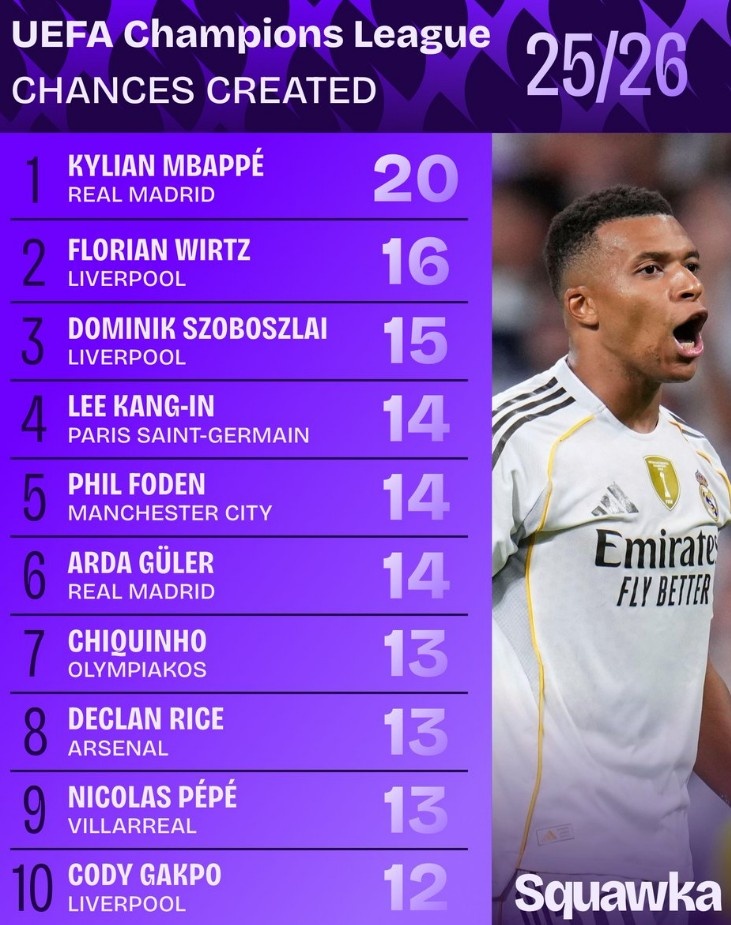 本赛季欧冠创造机会榜:姆巴佩20次居首,维尔茨次席,索博第三