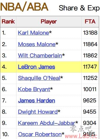 截至目前的数据显示,詹姆斯职业生涯累计出手11747次罚球,排在NBA历史第四位。
