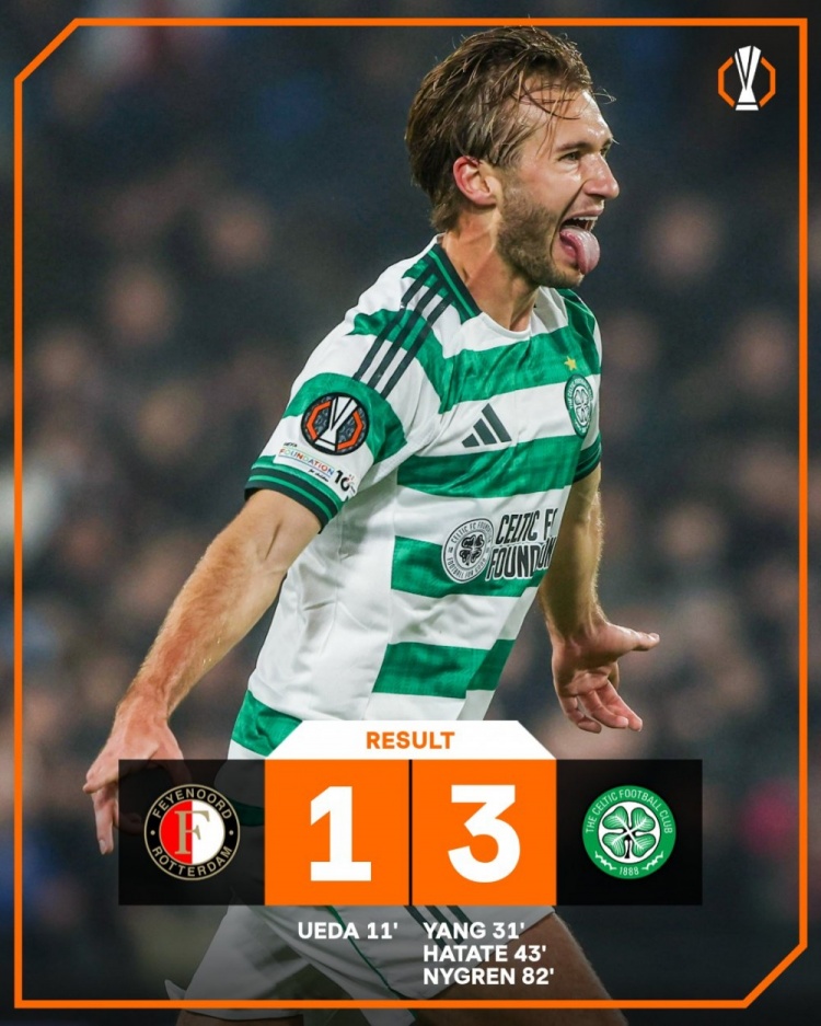 零点吧足球11月28日讯 欧联杯联赛阶段第5轮上演“日本德比”,最终凯尔特人客场3-1击败费耶诺德。