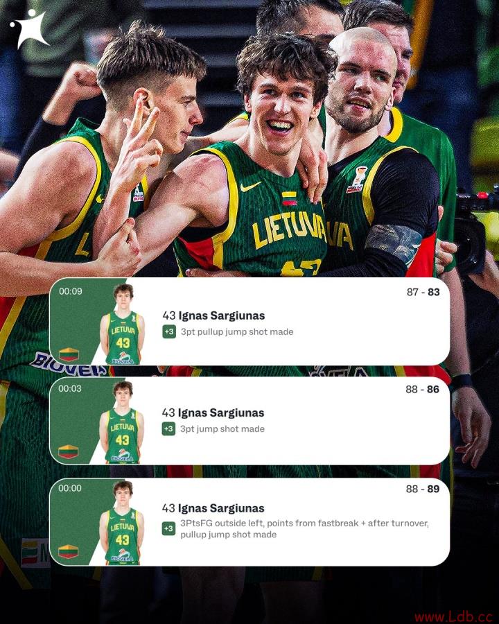 当时时间还剩12.9秒,立陶宛80-87落后英国,Sargiuna轰进三分球时间定格9.8秒,随后他再次轰进了三分,最后英国遭遇世界难题,Sargiuna以一记超远三分完成压哨绝杀。