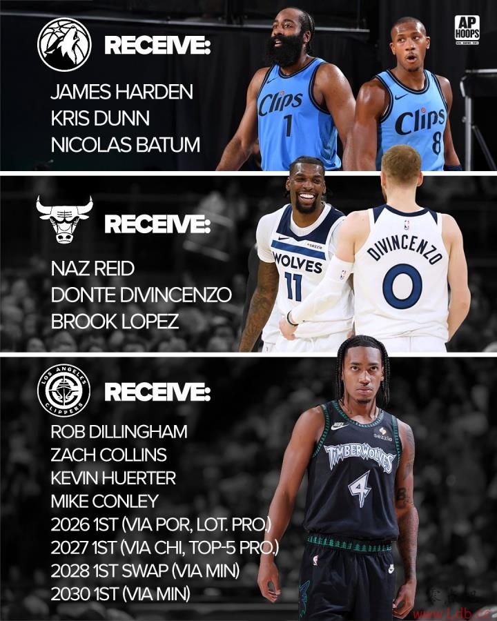 快船得到:迪林厄姆、扎克·科林斯、许尔特、康利、2026年首轮签(来自开拓者,乐透保护)、2027年首轮签(来自公牛,前5保护)、2028年首轮签互换权(来自森林狼)、20230年首轮签(来自森林狼)。