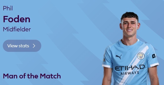 福登本场代表曼城首发出战并打满全场,开场闪击+补时绝杀,共打进两球。