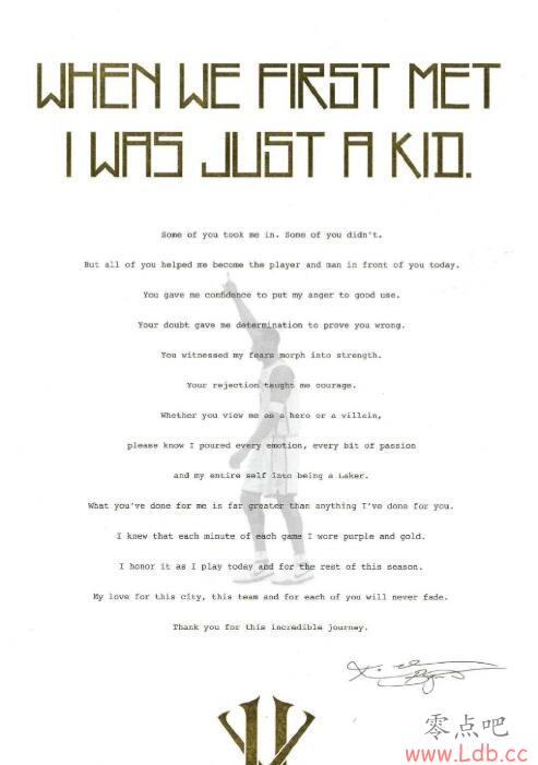 “这个赛季已经是我最后能倾尽的全部了。”科比在信中写到,“我的心还能够接受打击,我的意志还能让我继续坚持,但我的身体知道是时候说再见了。没关系,我已经准备好了。”