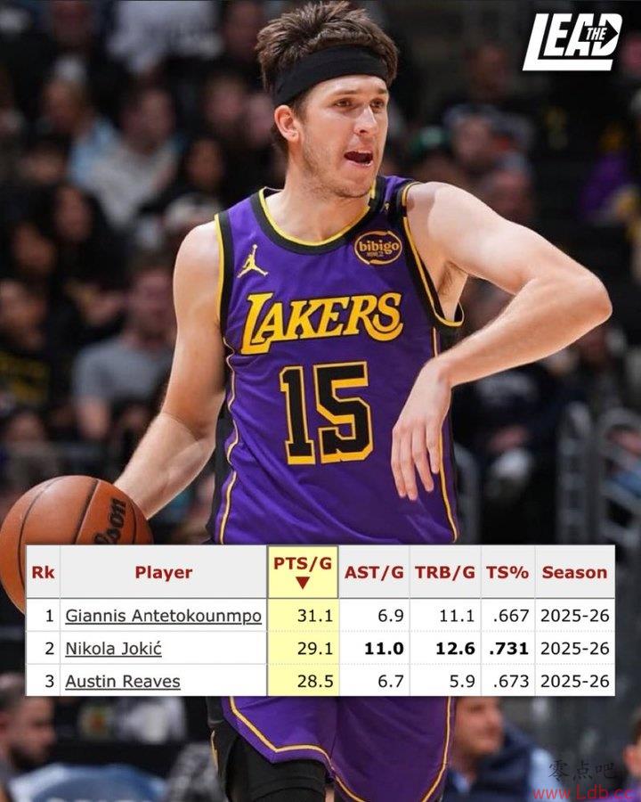 零点吧11月30日讯 美国数据媒体The Lead分享了一个数据,赛季至今只有三名球员能场均28+5+5且真实命中率65+%。