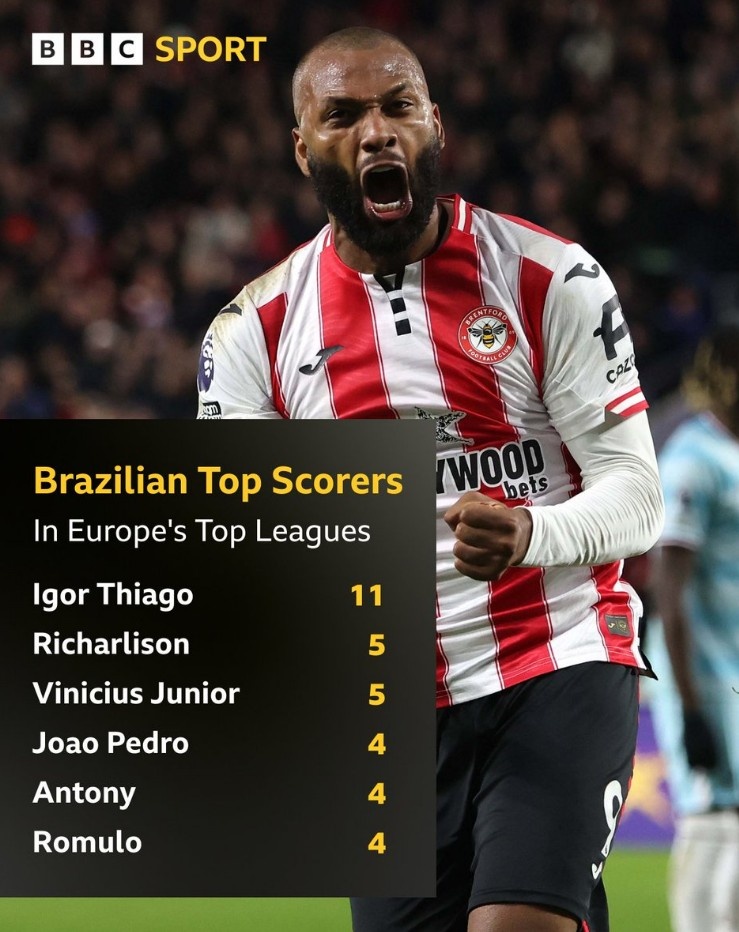 零点吧足球11月30日讯 在本轮英超,布伦特福德3-1击败伯恩利,伊戈尔·蒂亚戈梅开二度。