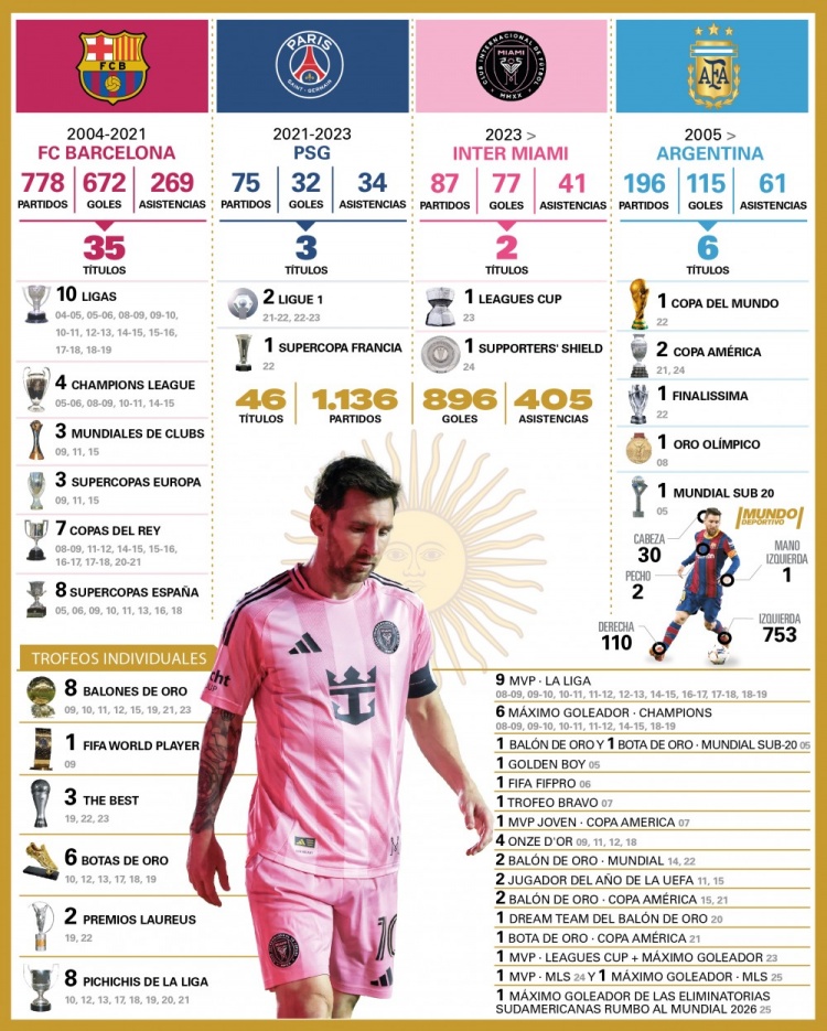 世体统计梅西各项数据:进球896个,助攻405次,冠军46座+8个金球