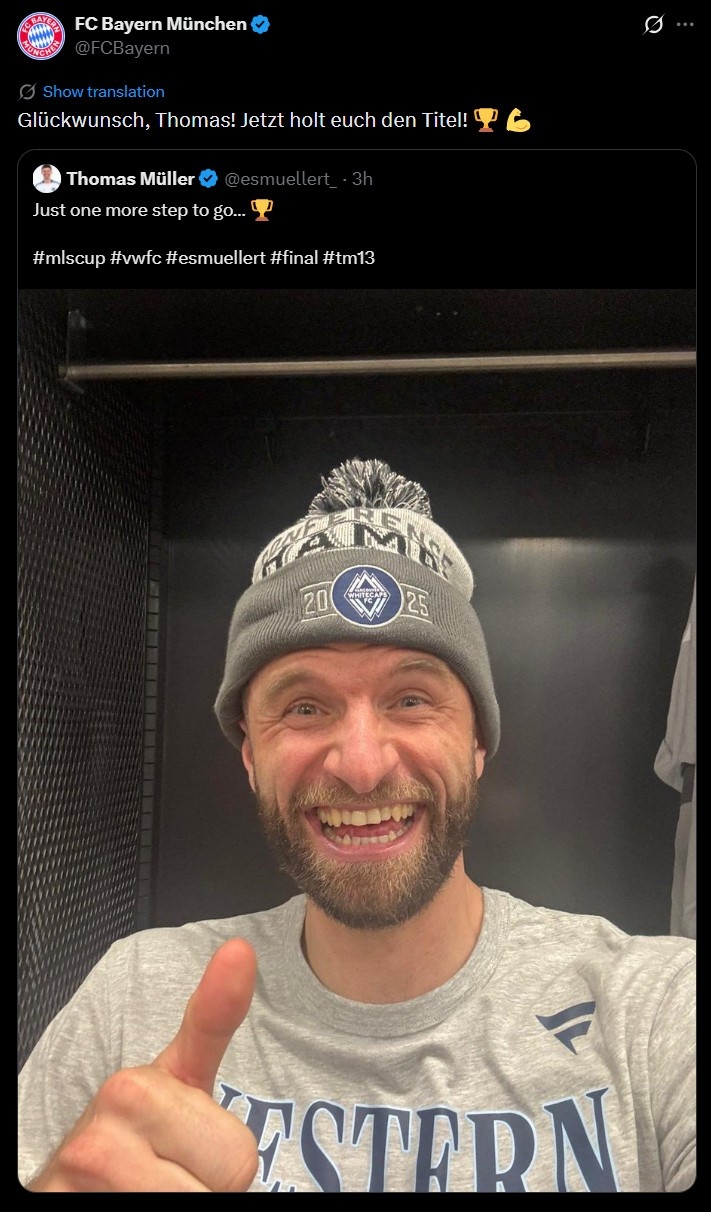 零点吧足球11月30日讯 美职联分区决赛,温哥华白浪击败圣地亚哥FC进入总决赛,拜仁旧将穆勒将随队参赛争夺冠军。