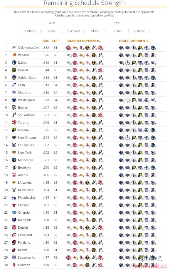 ??NBA剩余赛程难度:雷霆最难 勇士第4难 开拓者倒4 火箭最简单