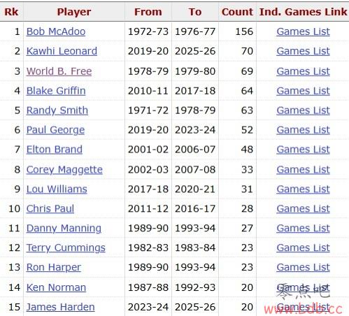 据统计,这是小卡快船生涯第70场30+,超越沃尔德·B·弗里(69场),升至队史第二,仅次于鲍勃·麦卡杜(156)。