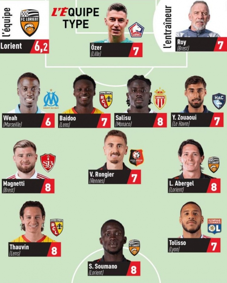 零点吧足球12月1日讯 法甲第14轮战罢,法媒队报评本轮联赛最佳阵,托万、维阿、托利索在列。