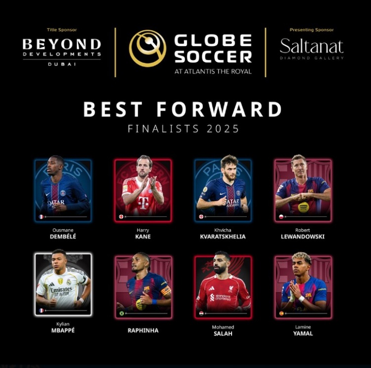 零点吧足球12月3日讯 环球足球奖官方公布2025年年度最佳前锋最终候选名单,登贝莱、凯恩、姆巴佩、亚马尔在列。