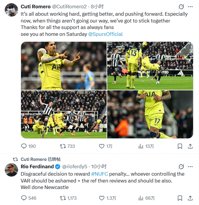 零点吧足球12月03日讯 本轮英超,热刺凭借中卫罗梅罗的双响客场2-2绝平纽卡,赛后罗梅罗在社媒转发费迪南德的评论,抗议纽卡获得的争议点球。