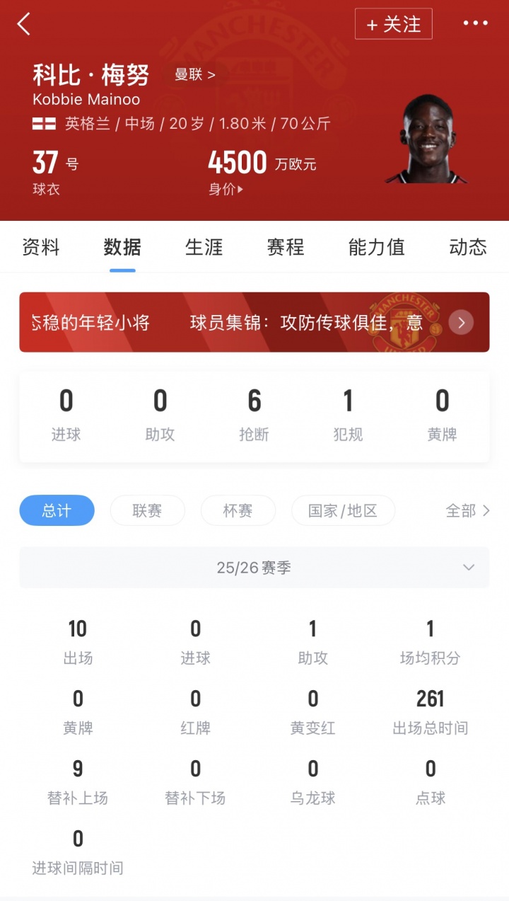 梅努本赛季代表曼联出战10场贡献1次助攻,目前身价4500万欧