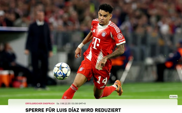零点吧足球12月06日讯 拜仁官方消息,迪亚斯欧冠禁赛上诉成功,禁赛由3场缩短至2场。