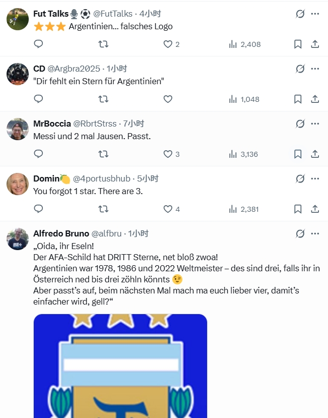 不少网友在该账号社媒下刷屏阿根廷是三星,提醒奥地利足协修改logo。