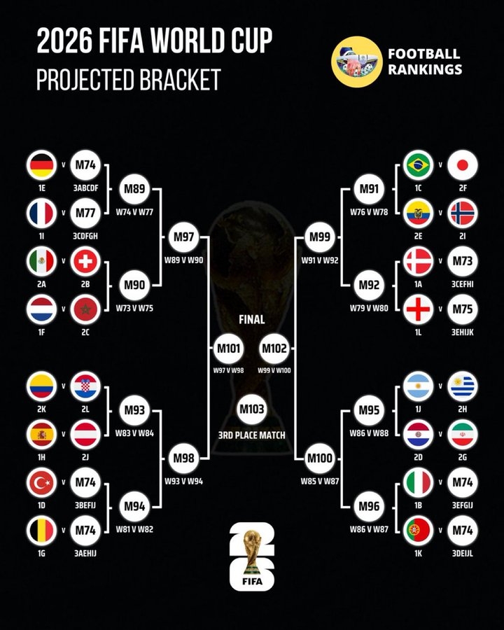 零点吧足球12月06日讯 2026世界杯抽签结束,结合此前公布的签位表,淘汰赛潜在对阵随之出炉。