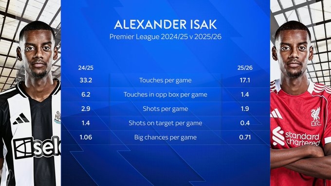 得不到支持?伊萨克利物浦时期对比纽卡,触球、射门等数据均下降