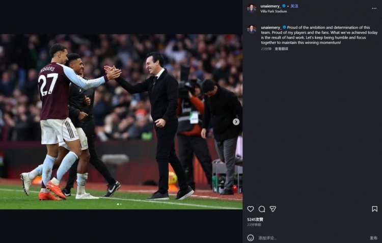 阿斯顿维拉主帅埃梅里赛后社媒发文: