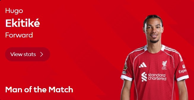 据赛后英超官方消息,利物浦前锋埃基蒂克被评选为此役最佳球员。