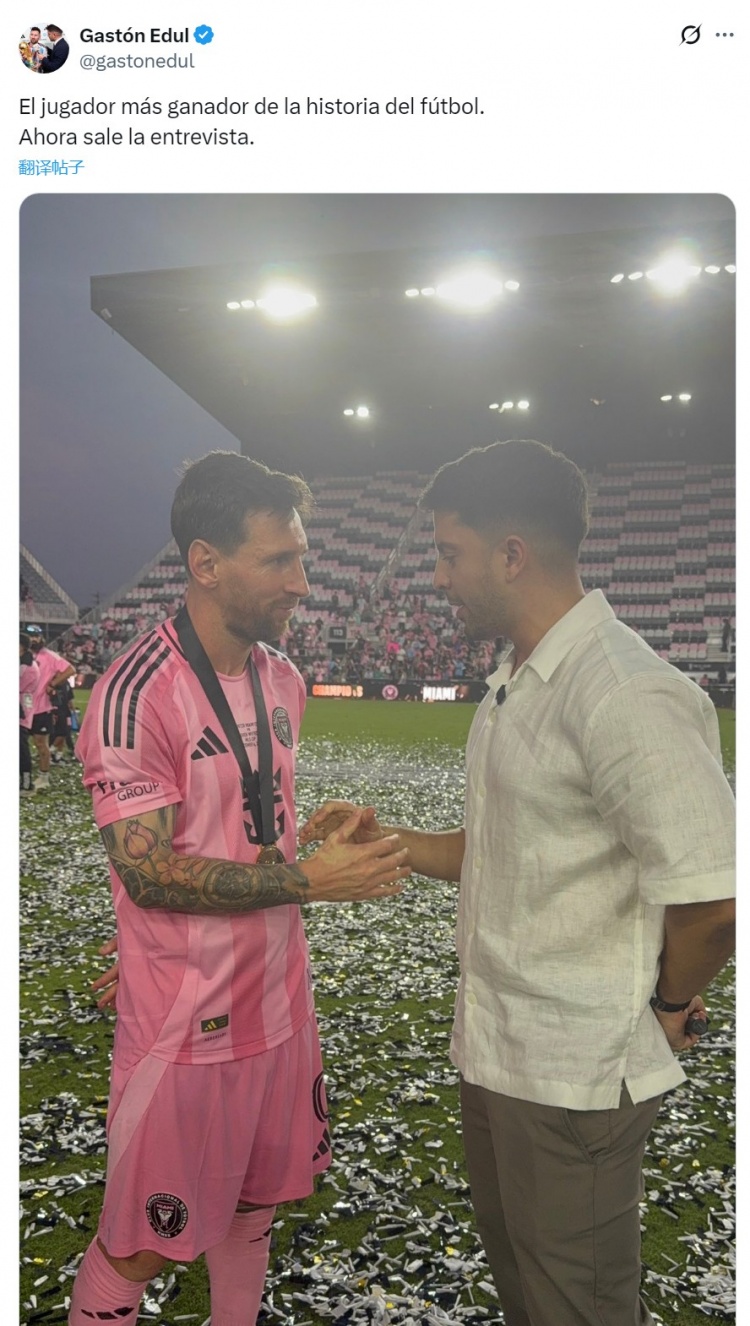 梅西斩获职业生第47座奖杯,阿根廷国家队跟队记者Gastón Edul社媒晒出与梅西的合照,配文:“足球史上荣誉最多的球员,采访内容即将发布。”