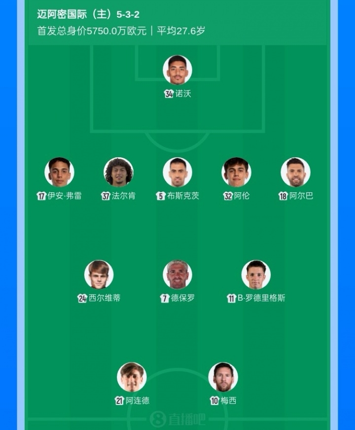 迈阿密国际首发:34-诺沃(阿根廷)、17-弗雷、37-法尔肯、5-布斯克茨(老友)、32-阿伦、18-阿尔巴(老友)、24-西尔维蒂(阿根廷)、7-德保罗(阿根廷)、11-B·罗德里格斯(阿根廷)、10-梅西(阿根廷)、21-阿连德(阿根廷)
