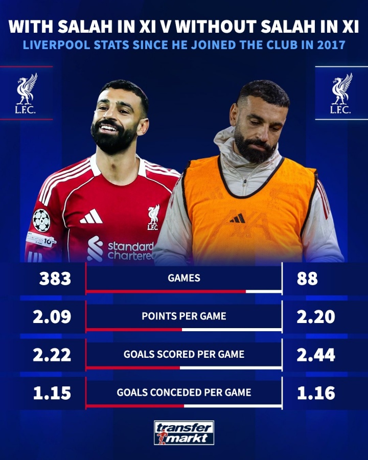 萨拉赫出场&不出场利物浦数据对比: