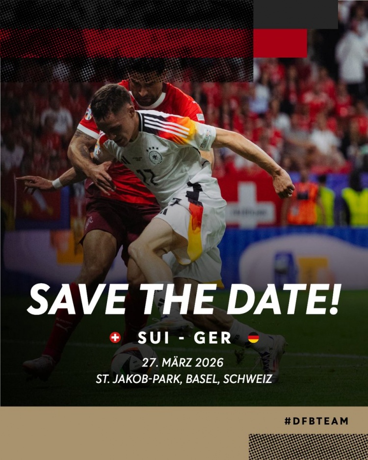 零点吧足球12月8日讯 德国足协官方消息,德国国家队明年3月的友谊赛对手已经确定为瑞士队,比赛时间为当地时间2026年3月27日,比赛将在瑞士巴塞尔进行。