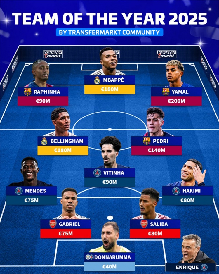 德转票选2025年度最佳阵:姆巴佩、亚马尔、贝林厄姆、佩德里在列