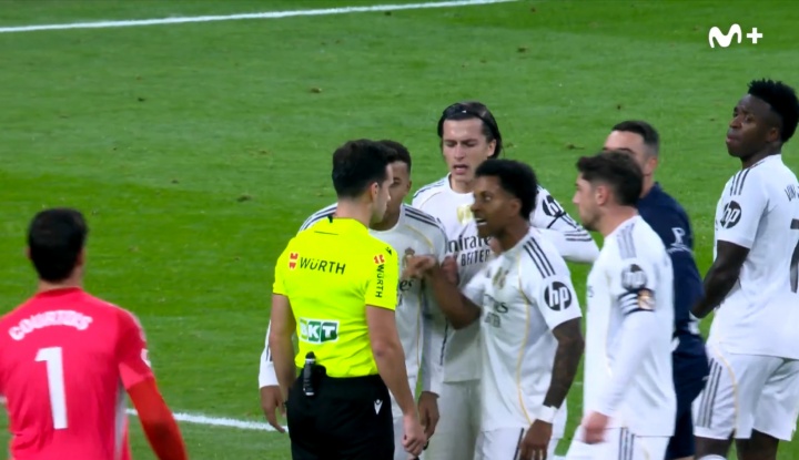 比赛补时阶段,主裁金特罗·冈萨雷斯先是向抗议的卡雷拉斯出示黄牌,随后又直红将其罚下场,多名皇马球员立即围向裁判抗议。