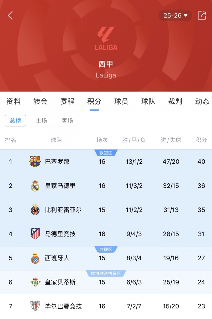 目前比利亚雷亚尔在少赛一场的情况下落后榜首巴萨5分,只落后皇马1分。