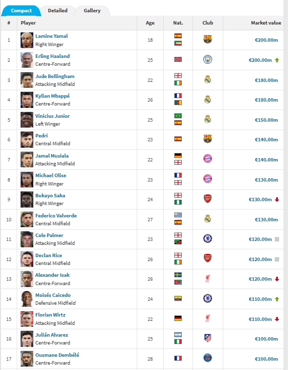 足坛亿元先生17人:亚马尔哈兰德2亿领衔,英超西甲各7人,意甲0
