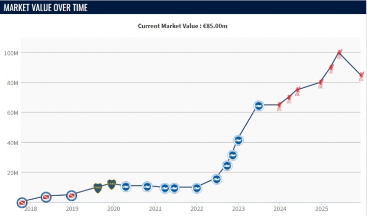 零点吧足球12月10日讯 德转昨日更新英超球员身价,利物浦中场麦卡利斯特身价半年间从1亿欧跌至8500万。