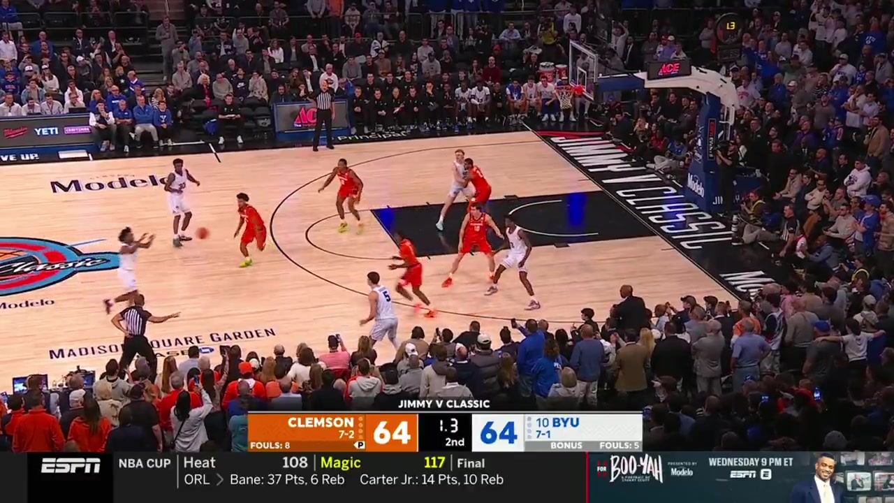 NCAAJimmyV经典赛在尼克斯主场麦迪逊广场花园进行,杨百翰大学以67-64逆转险胜克莱姆森大学,实现22分大逆转,拿下五连胜
