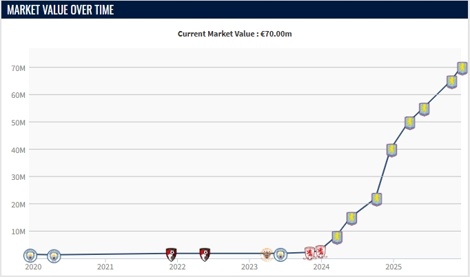 零点吧足球12月10日讯 英超身价昨日进行了一次更新,阿斯顿维拉的中前场大核心摩根·罗杰斯身价涨至7000万欧。他加盟维拉之后,身价已经八连涨,从280万一路飙升到7000万。
