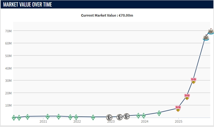 23岁的沃尔特马德今夏7500万欧加盟纽卡,若加上附加费用最高可达9000万欧。他加盟英超后,因为高额转会费,身价从3000万上涨到6500万。如今又一次涨价,证明了纽卡的眼光真不错。