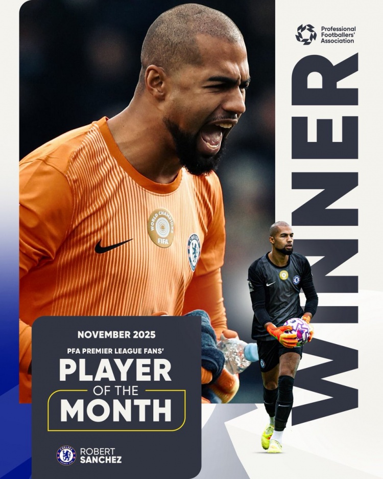 零点吧足球12月10日讯 PFA(英格兰职业球员工会)官方消息,切尔西门将罗伯特·桑切斯被球迷评为英超11月最佳球员。