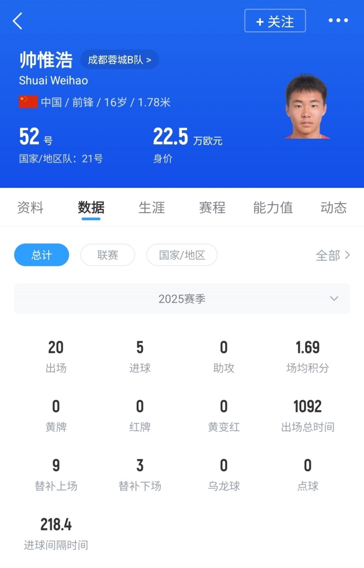 零点吧足球12月12日讯 近日,德转更新了中乙球员身价,其中16岁的成都蓉城B队小将帅惟浩身价涨至22.5万欧,放眼世界范围2009年出生的球员中,帅惟浩的身价排名第22,亚洲第一!