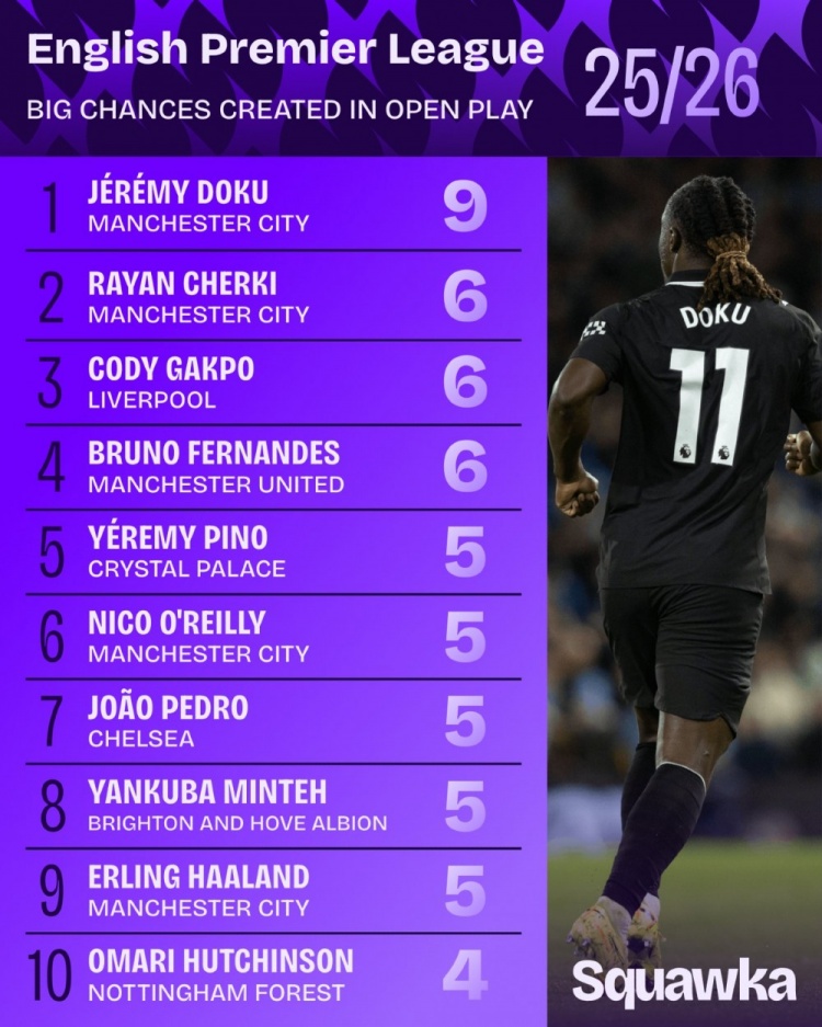本赛季英超运动战创造重大机会榜:多库9次居首,B费、谢尔基6次