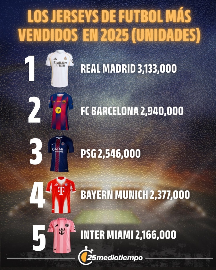 国际迈阿密如今已与皇马、巴萨、巴黎圣日耳曼和拜仁慕尼黑并肩,组成全球最顶级的球衣销售阵营。这五家俱乐部在2025年均售出超过200万件球衣。作为MLS冠军,国际迈阿密的销量达到2,166,000件,而这一切都源于梅西自2023年7月加盟佛罗里达以来所带来的巨大推动力。与此同时,葡萄牙球星C罗凭借强大的个人号召力,帮助利雅得胜利卖出1,281,000件球衣。