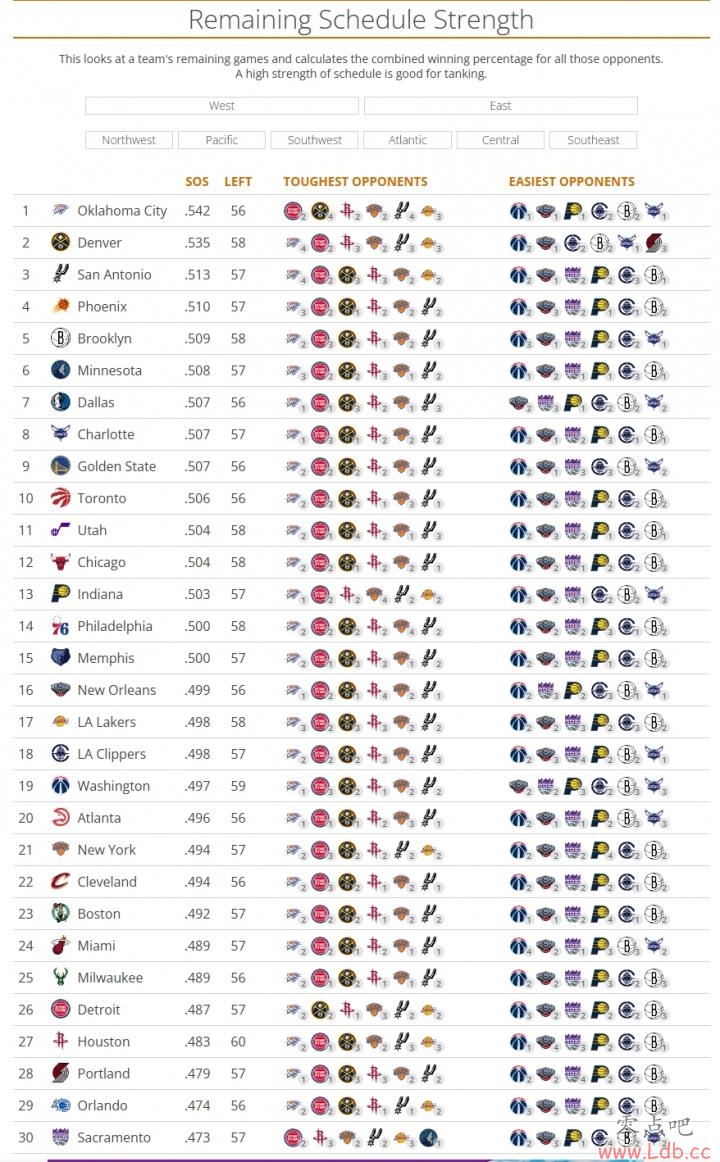 剩余赛程难度:雷霆最难 勇士第9 湖人17 快船18 火箭&开拓者轻松